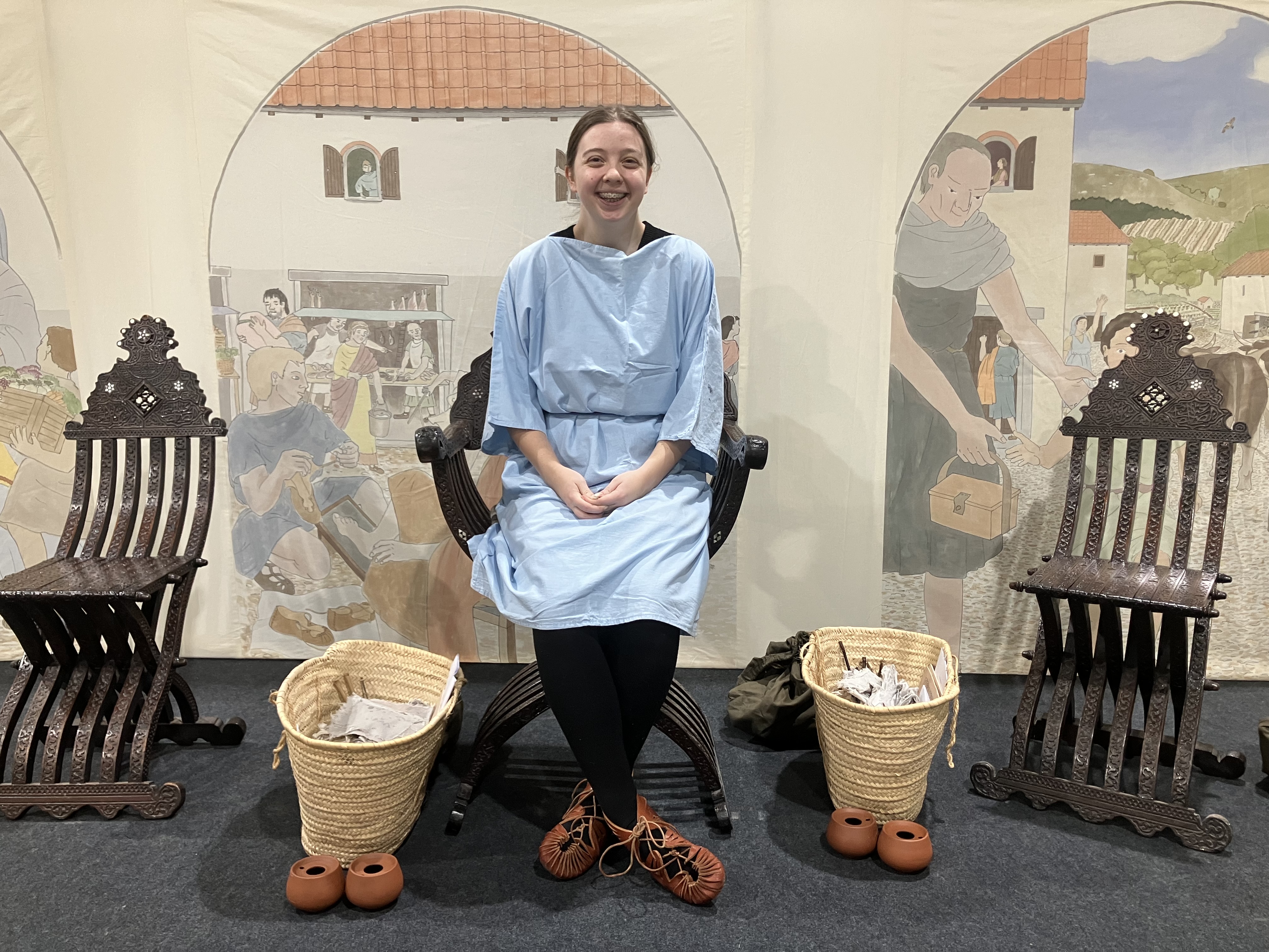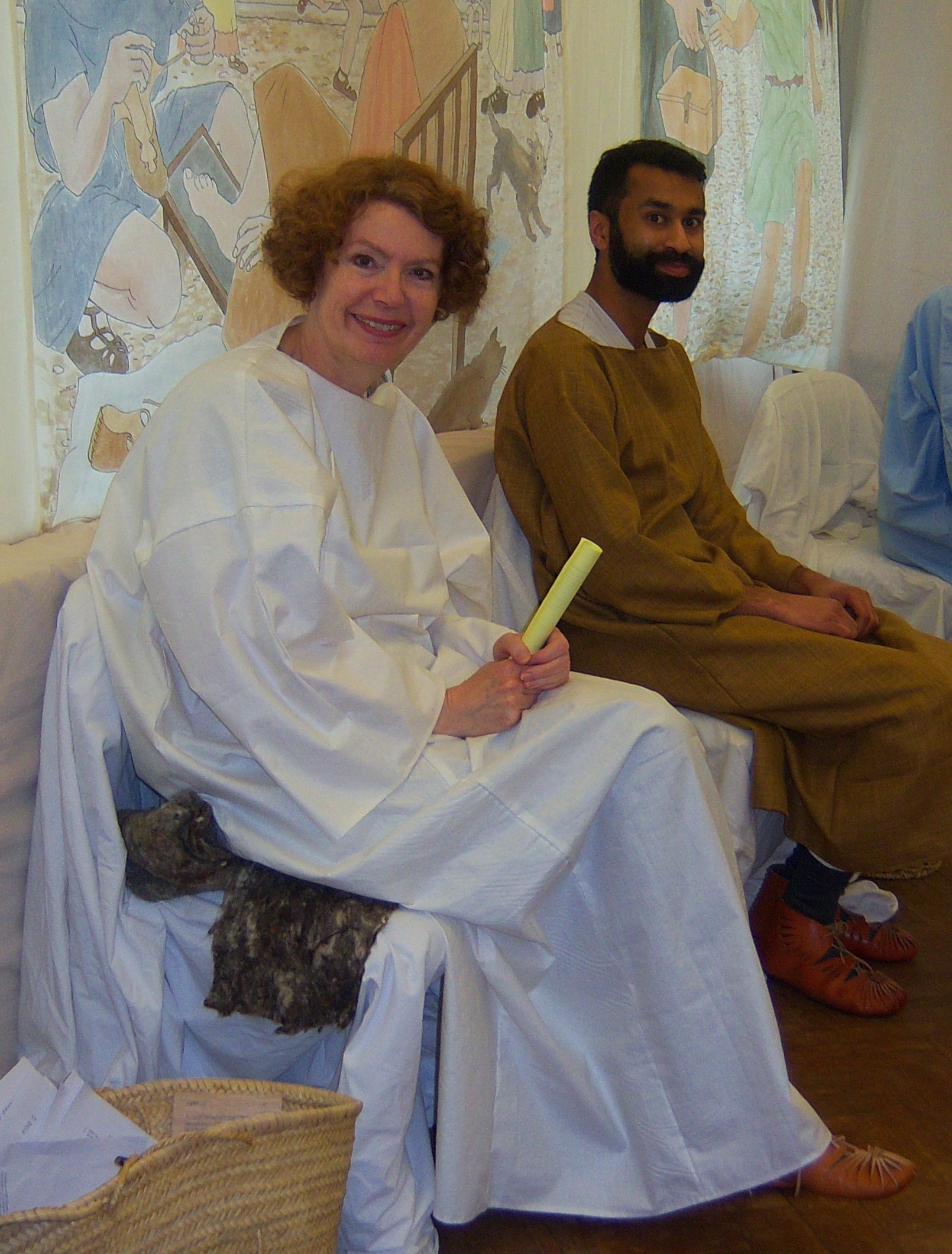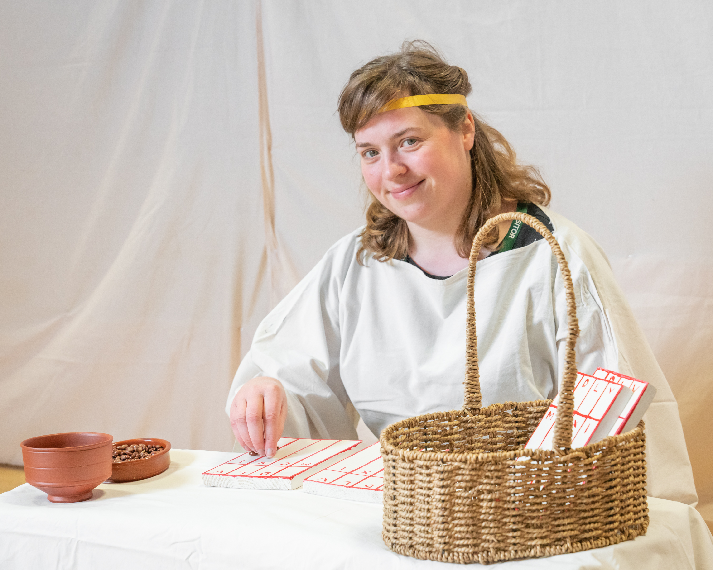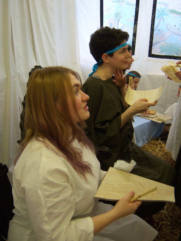 Professor Eleanor Dickey – Trustee and the person who did the underlying research (University of Reading professor). Photo by Claire SmithCharles Stewart – Trustee and the person who really makes it work (University of Reading graduate). Photo by Claire Smith.Professor Emma Aston – Trustee and the person who keeps calm when things go wrong (University of Reading professor)Professor Christa Gray – Trustee (University of Reading professor)Dr Marigold Norbye – Trustee (University College London lecturer), and Dr Sam Agbamu – Schoolroom teacher (University of Reading lecturer)Jacinta Hunter – Schoolroom teacher (University of Reading undergraduate). Photo by Claire Smith.Adel Ternovacz – Schoolroom teacher (University of Reading PhD student).Rebekah Marsh – Schoolroom teacher (University of Reading undergraduate)Alexa Wolff – Schoolroom teacher (University of Reading undergraduate)Ilaria Truzzi – Schoolroom teacher (University of Reading PhD student)Professor Philomen Probert – the person who originally designed the maths (University of Oxford professor).Althea Sovani – Schoolroom teacher (University of Oxford graduate student)Aster Blunn – Schoolroom teacher, pen carver (University of Reading undergraduate)Isabella Woor and Braedon Fogarty – Schoolroom teachers (University of Reading undergraduates)Hannah Armstrong – Schoolroom teacher (University of Reading undergraduate)Nadin Marsovszki – Schoolroom teacher and former associate director (University of Reading graduate). Photo by Claire SmithSusanna Mezzadri, Schoolroom teacherTiri Jones – Schoolroom teacher (University of Reading undergraduate)Nicholas Romanos, Krasimir Ivanov, and Oroel Marcuello – Latin-speaking schoolroom teachers at the Oxford Latinitas ancient schoolroomProfessor Daniela Colomo – Schoolroom teacher, seller of deadly curses, and former Trustee (University of Milan professor)Dr Tim Penn – Schoolroom teacher (University of Reading lecturer)Lucy French and Toria Curgenven – Costumers and (in Lucy’s case) sewing wizard (University of Reading undergradates)Rosemary Aston – the artist who made our windows (mother of University of Reading professor Emma Aston)