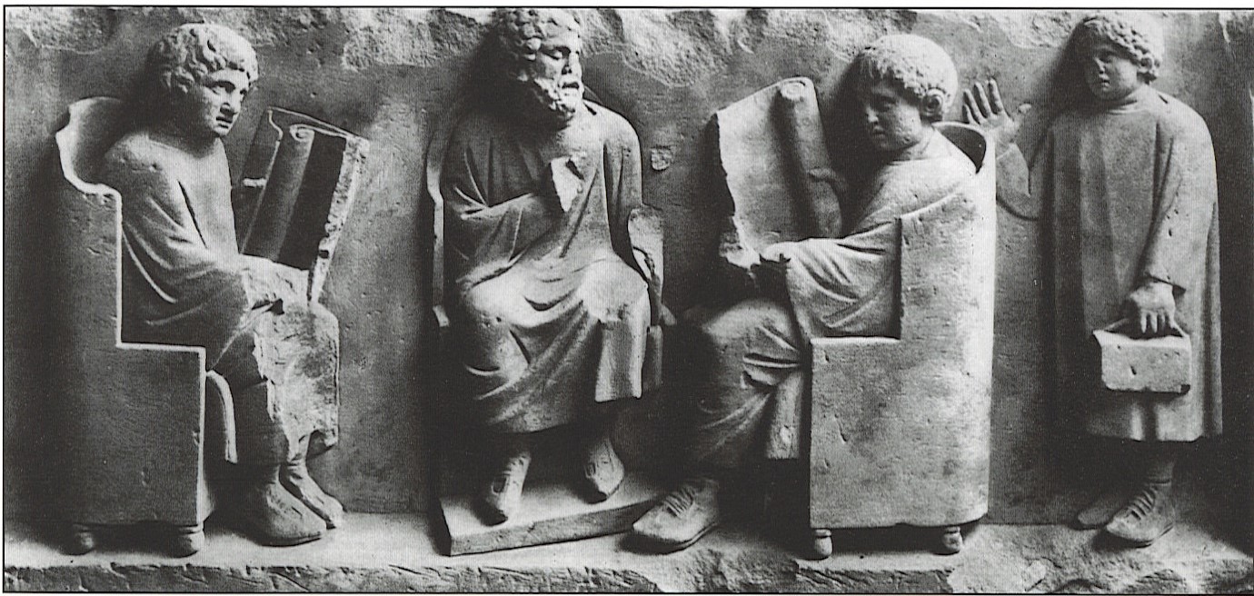 Our ancient schoolroom costumes are modelled after the ones worn by both children and teacher in this relief: