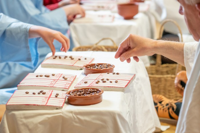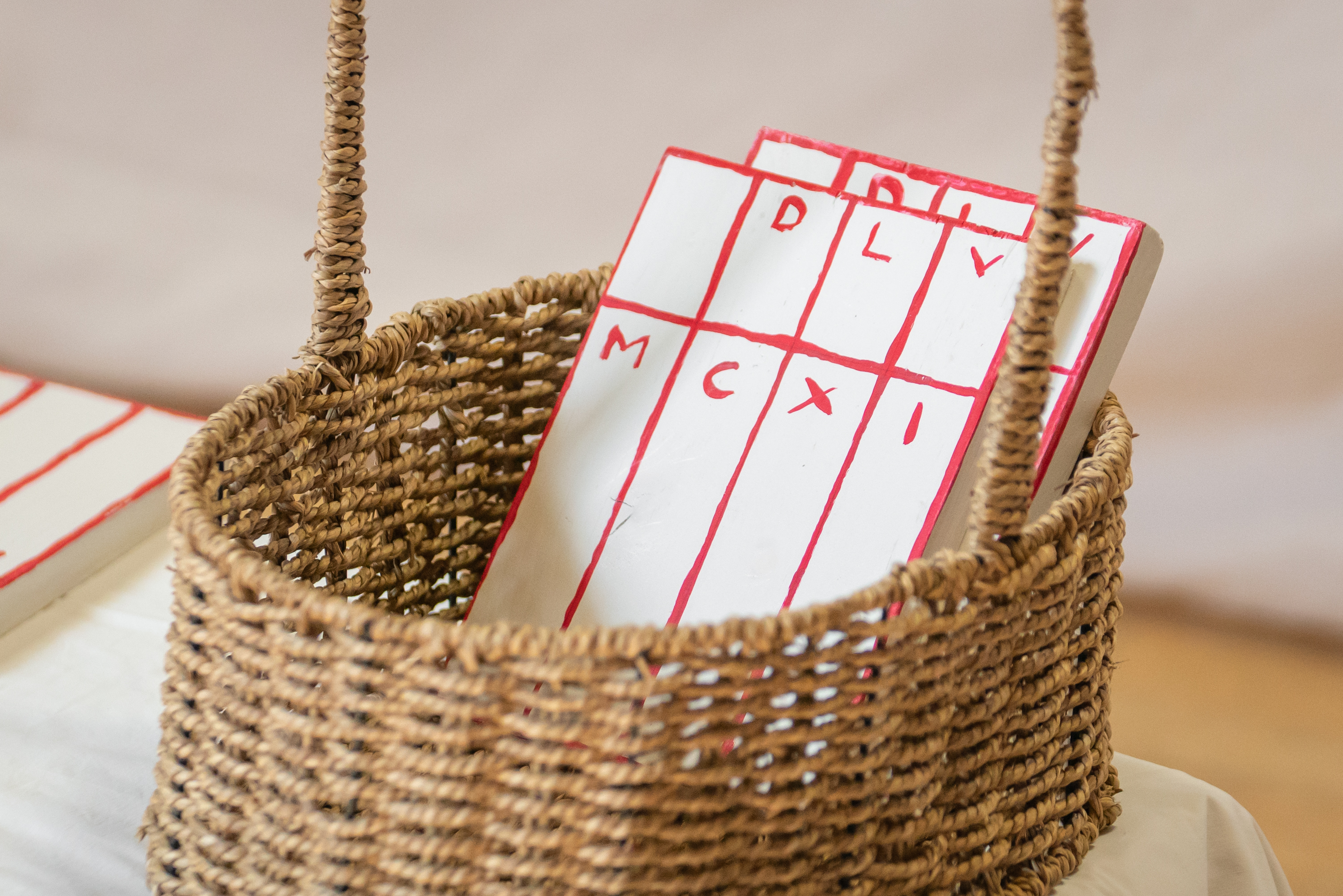 Maths lessons use dried beans (calculi) on counting boards (tabulae) with Roman numerals; we have a variety of these made of stone and wood. Most of them we made ourselves (you could too – they are very simple).