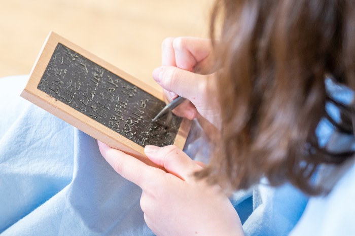 Romans used wax tablets (tabellae ceratae) for writing letters, business documents, and school exercises; although small enough to fit comfortably in one hand the tablets usually held a lot of text, because the ancients wrote very small. The writing implement is a stylus (stilus), a pointed piece of metal, bone or wood; most of our styluses are made of iron and not quite as sharply pointed as the ancient ones, to avoid accidents. The tablets and metal styluses come from the Roman shop, but we also have some wooden styluses that we make ourselves by sharpening twigs with a pencil sharpener. The wax is beeswax, with a bit of black dye. Tablets can be erased by smoothing the wax with the back end of the stylus. Erasing becomes difficult when pupils press too hard with the stylus and gouge out the wax; under those circumstances we heat a stylus in a candle flame and melt the wax back into position, sometimes adding more. With this loving treatment many of our original tablets from 2014 are still in fine shape despite getting a lot of use.